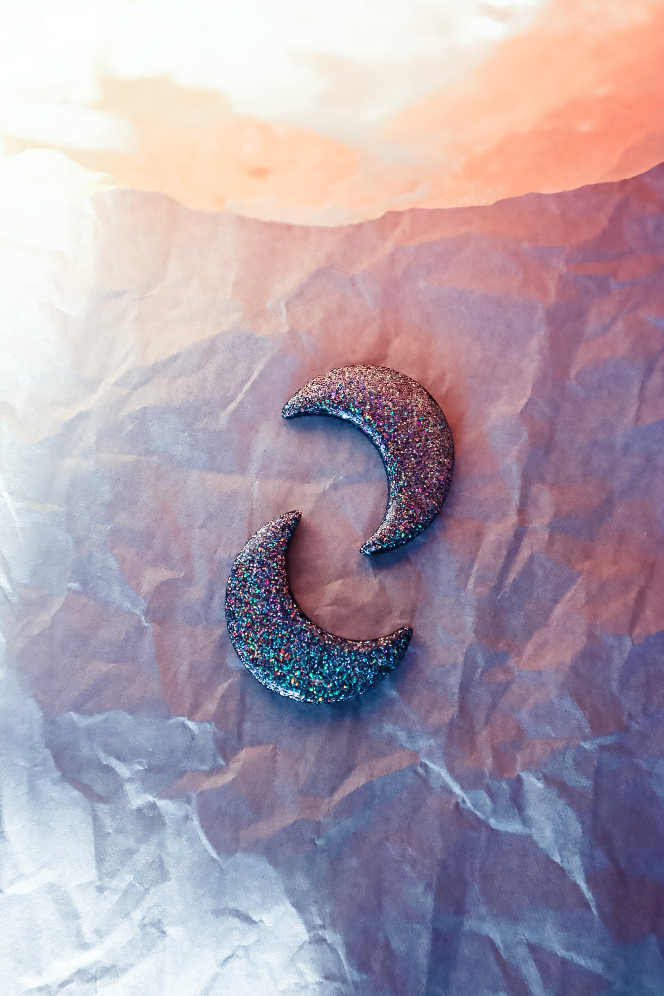 Crescent moon studs with an epic holographic glitter shine. Posts are hypoallergenic surgical steel.