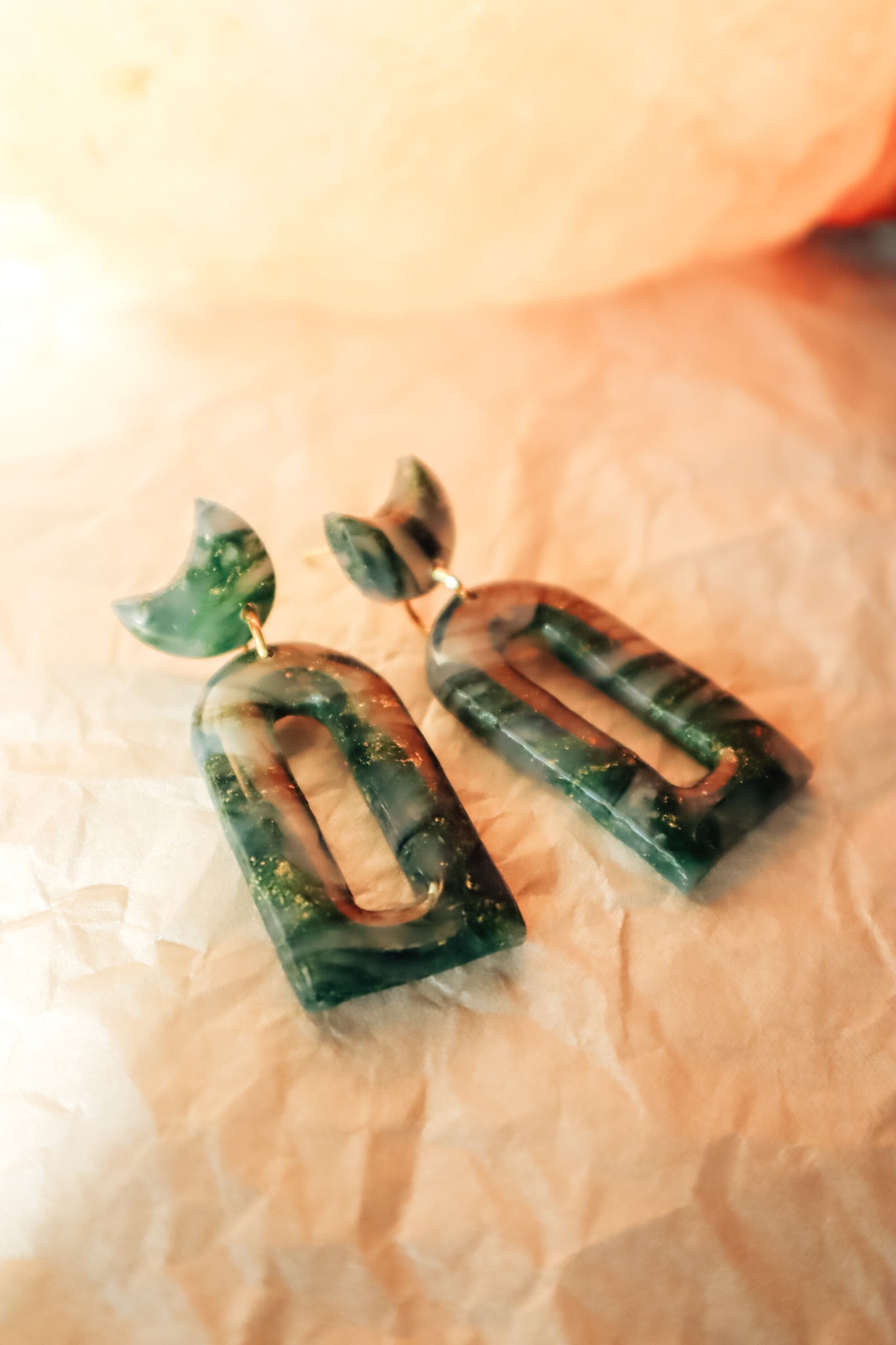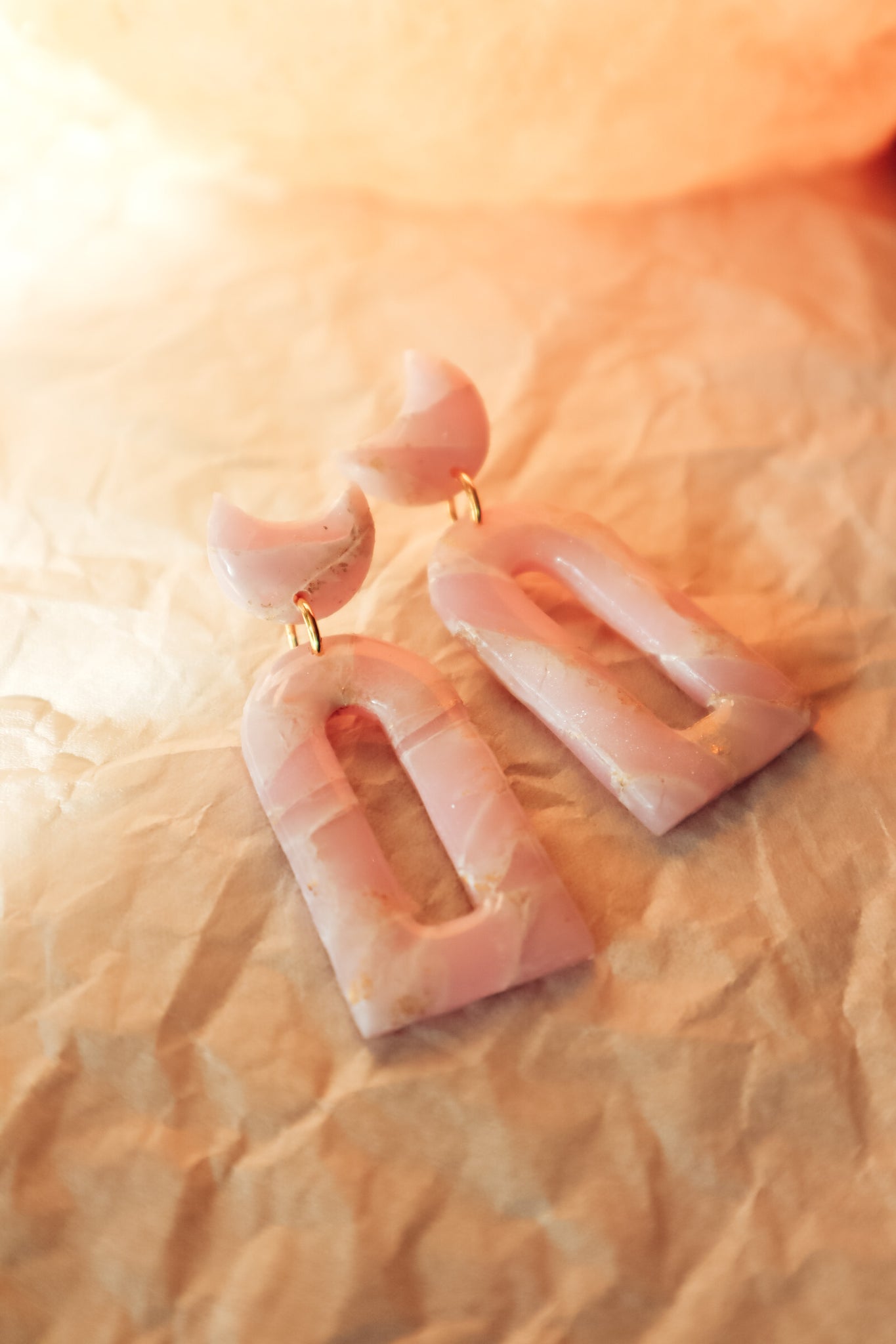 Colors of a moonrise, in the shape of a portal, with crescent studs and hypoallergenic findings.
